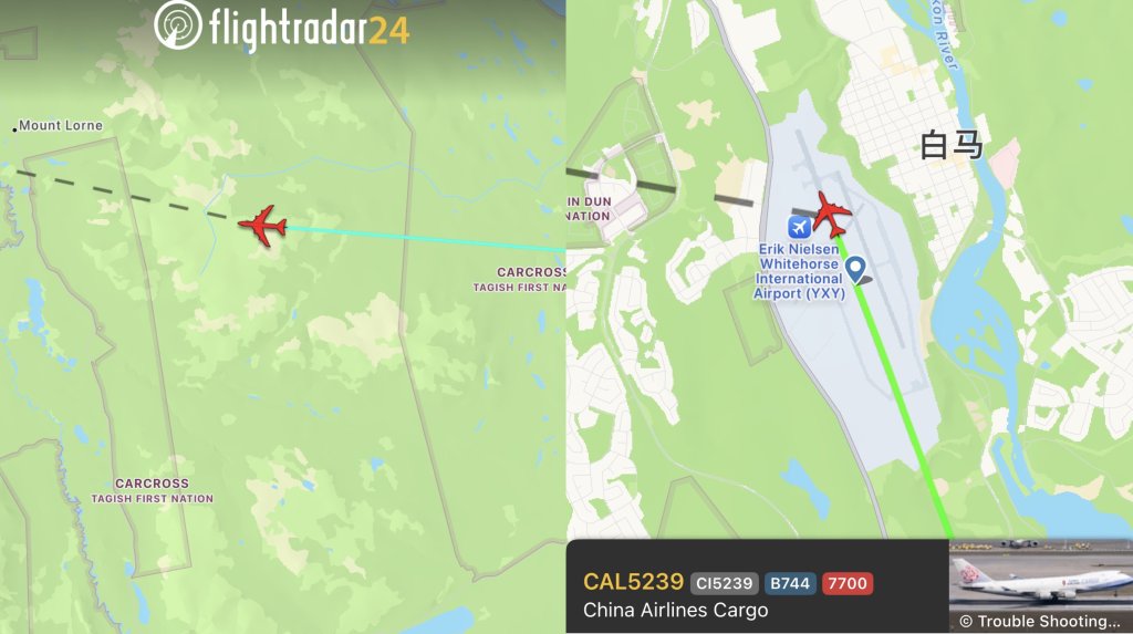 華航一架原訂從芝加哥飛往阿拉斯加的CI5239班機,台灣時間今(18)日晚間8時許,在航班飛行了4個小時後,突然掛上緊急代碼7700,班機緊急轉降加拿大白馬市機場,狀況尚不明,還有待華航進一步說明。