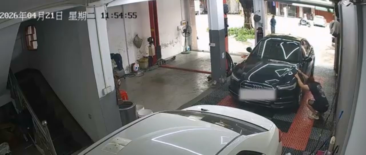 4月21日廣東一家修車廠發生意外事故,男子打開奧迪引擎蓋檢查,因為搖晃車身的關係,導致引擎蓋直接掉下來把手夾住,女子急忙跑過來想要幫忙,結果反而開了後車廂。