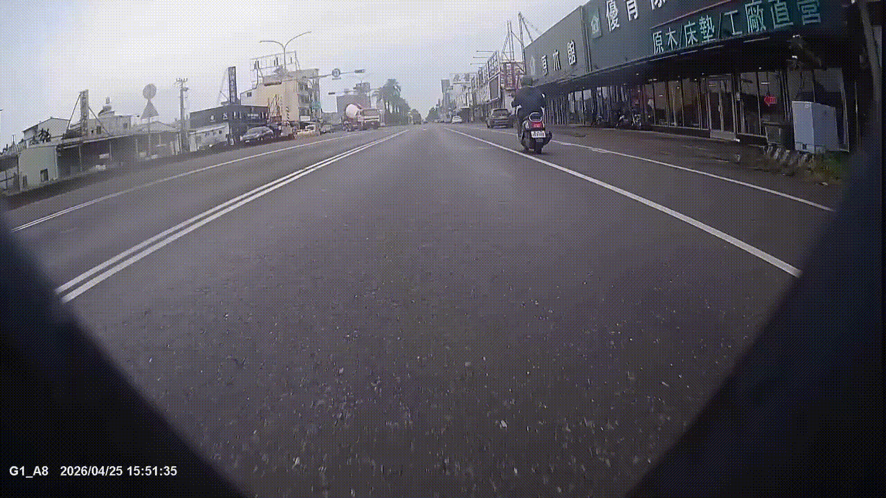從後方的行車紀錄器來看,當時騎士直行,而遇上要左轉的水泥預拌車,騎士見狀明顯嚇了一大跳,緊急煞車,但車子煞不住,他整個人撞了上去,最後重摔在地,一動不動。